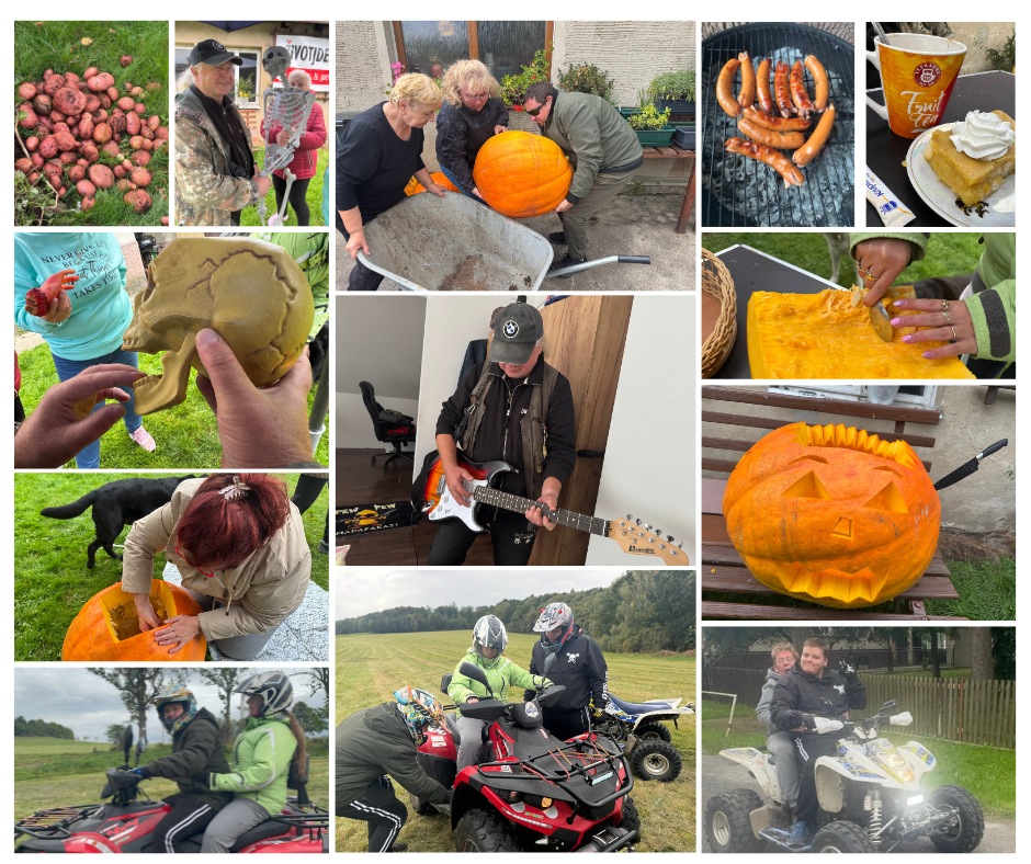 Sobota ve znamení vůní a výbuchů smíchu. Fanda rozjel gulášovou jízdu, Maci se Zuzkou čarovaly s dýňovou polívkou, a ostatní dlabali dýně tak urputně, že by se Michelangelo zastyděl. Výsledná dýně svítila v noci jak maják punkové naděje!